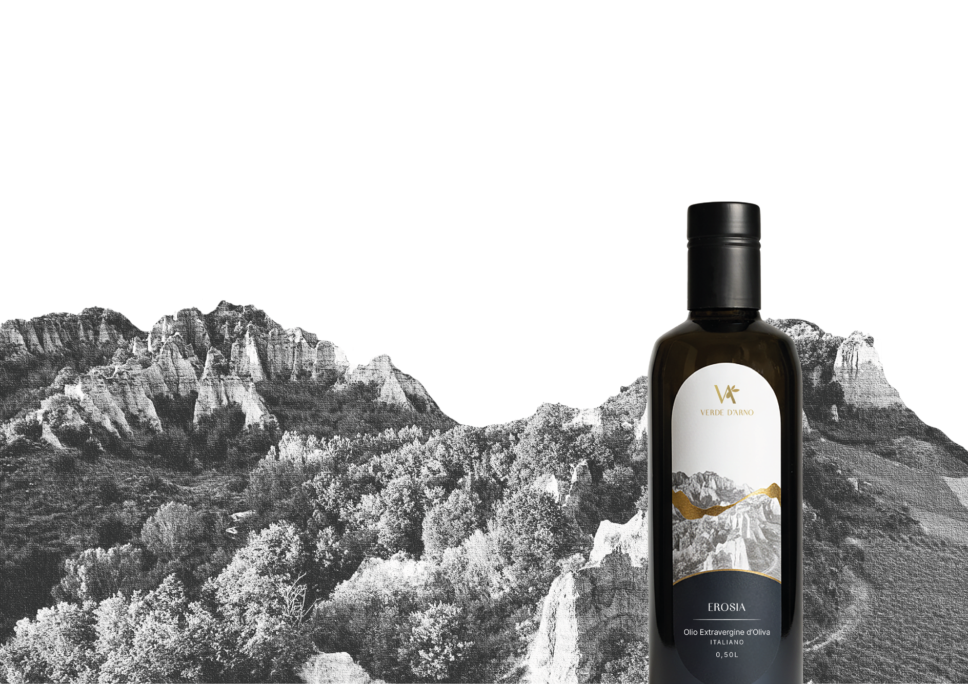 Erosia führt durch den Balze del Valdarno , natürliche Skulpturen aus der Erde und Licht. Ein Öl, das die alte Stärke und die reine Note dieses toskanischen Abends enthält.